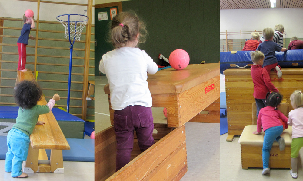 Elementare Bewegungsformen wie Springen, Klettern, Balancieren, Rutschen oder Kriechen werden dabei gezielt angeregt. Gleichzeitig knüpfen die Kinder erste soziale Kontakte, lernen Regeln kennen und erleben Gemeinschaft. Reime, Kniereiter und einfache Spiele runden die Turnstunde ab.